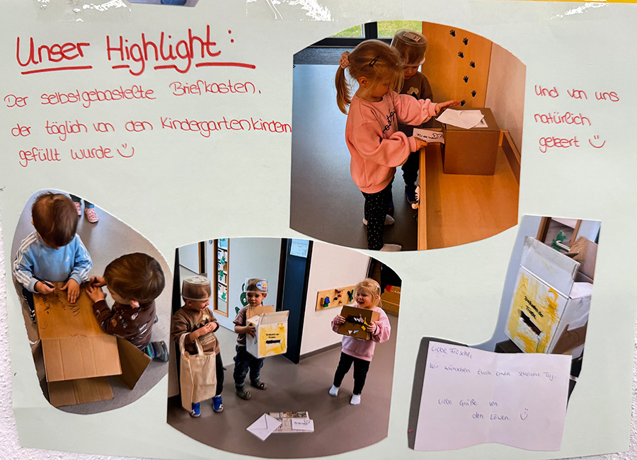 Ein besonderes Highlight waren die selbstgebastelten Briefkästen. Diese wurden immer wieder von Kindern, Eltern und dem Personal der Kita mit Briefen gefüllt. Die Briefe wurden mit großer Freude gelesen, beantwortet und anschließend von den Kindern auch persönlich zugestellt.